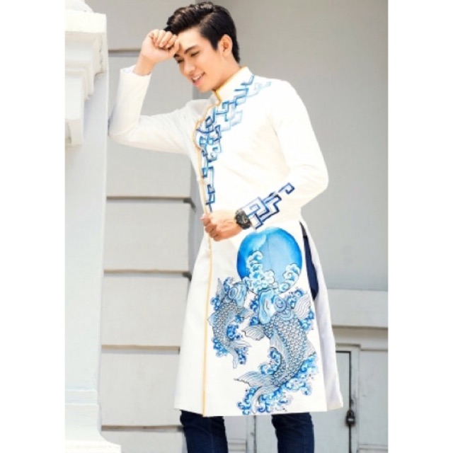 Ao Dai Cach Tan Nam Mau Trắng Họa Tiết Ca Chep Sang Hmb105