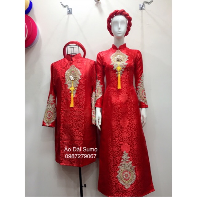 Ao Dai Cặp Co Dau Chu Rể Gấm đỏ Ao Dai Tai Lộc