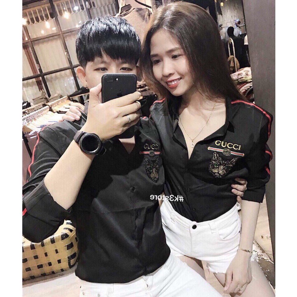 Ao Sơ Mi Cặp đoi Mau đen Họa Tiết Gusi Nhẹ Tiki Vn