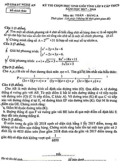 đề Thi Hsg Toan 9 Tỉnh Nghệ An Năm Học 2017 2018 Olympic Toan Học Toan Học Thuần Tuy