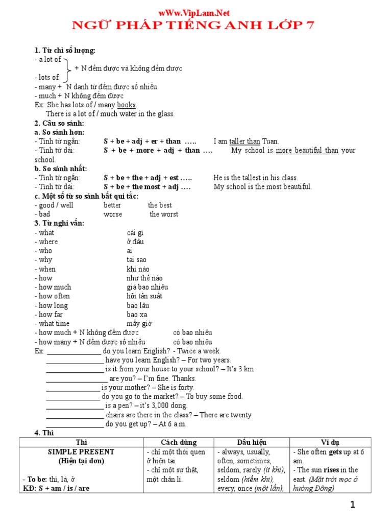 Tổng Hợp Ngữ Phap Va Bai Tập Tiếng Anh Lớp 7 Gshop Vn