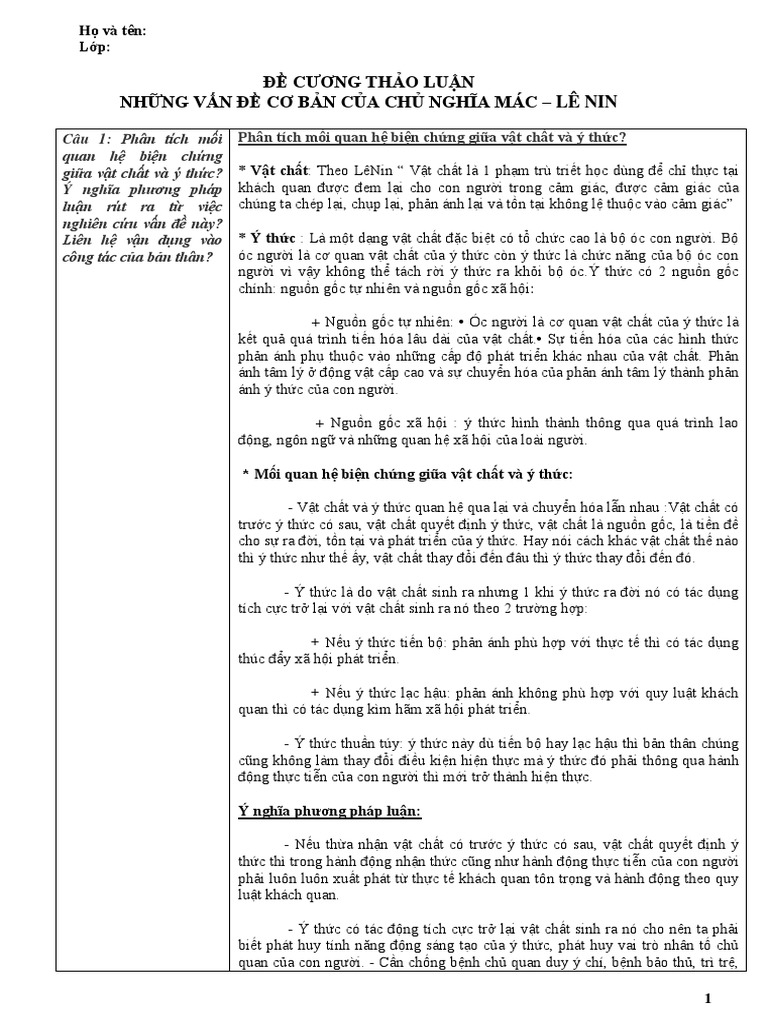 đề Cương Thảo Luận Những Vấn đề Cơ Bản Của Chủ Nghĩa Mac Le Nin